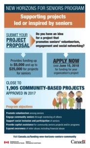 The New Horizons for Seniors Program is providing federal grants of up to $25,000 to organizations that empower seniors to initiate and participate in activities that benefit the community. The deadline to apply is June 15, 2018. If you have a community project that is led by seniors or inspired by seniors, you are invited to apply.